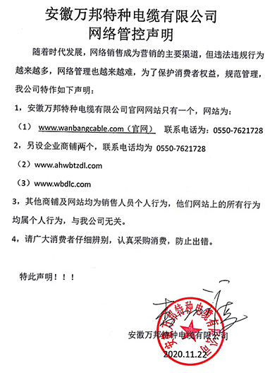 鄭重聲明:安徽萬邦特種電纜有限公司官方網站為:www_wanbangcable_com.kingrilin.com,除此之外無任何子網站或合作網站,其余均為假冒偽劣。電話:0550-7621728 13485756353 地 址:安徽省天長市滁州高新技術產業開發區經四路29號